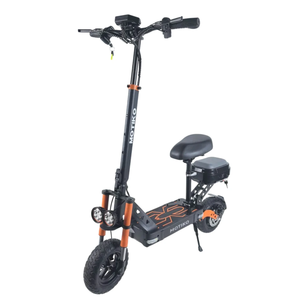 Motiko G1 продуман для максимальной гибкости. Съёмное сиденье с амортизацией и регулировкой по высоте позволяет легко трансформировать самокат: установите сиденье для спокойных прогулок или уберите его для активной езды стоя. Это электросамокат с сиденьем, который одинаково хорош для коротких поездок и длительных маршрутов. В комплекте идёт вместительный съёмный кофр – идеальное решение для перевозки покупок, документов, сменной обуви или личных вещей. Это электросамокат с корзиной, который станет незаменимым помощником в повседневных делах. Складная конструкция позволяет сложить самокат за секунды, превращая его в компактный модуль для транспортировки и хранения. Вес 28 кг и прочная стальная рама обеспечивают устойчивость и долговечность. Регулируемый по высоте руль позволяет настроить управление под любой рост райдера. Антискользящая платформа и удобная подножка дополняют практичность.