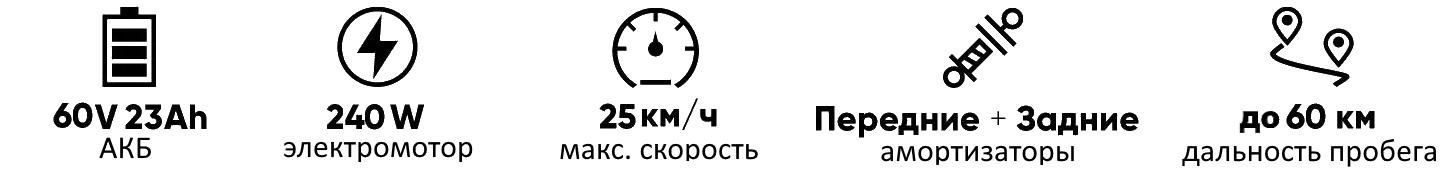 Мощный съемный аккумулятор 48V 23Ah обеспечивает рекордные 60 км на одном заряде! Заряжается всего за 6 часов.