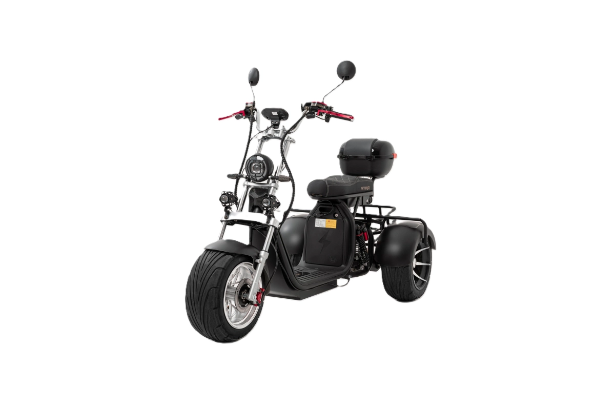 IKINGI X12 PRO Trike создан для тех, кто ценит уверенность и безопасность на дороге. Трёхколёсная конструкция обеспечивает исключительную устойчивость, исключая риск опрокидывания на поворотах, при парковке или на скользкой дороге. Это особенно важно при перевозке пассажиров или ценных грузов. Широкие 18-дюймовые колёса с бескамерными покрышками и мощная стальная рама гарантируют отличную проходимость и долговечность. Это настоящий электроскутер для бездорожья, способный преодолевать самые сложные участки – от грунтовок до городских бордюров. Антискользящая платформа обеспечивает безопасную и уверенную постановку ног. Благодаря внушительным габаритам и колёсной базе, трицикл отличается превосходной курсовой устойчивостью даже на высоких скоростях. Это электроскутер с большими колесами, созданный для любых дорожных условий.