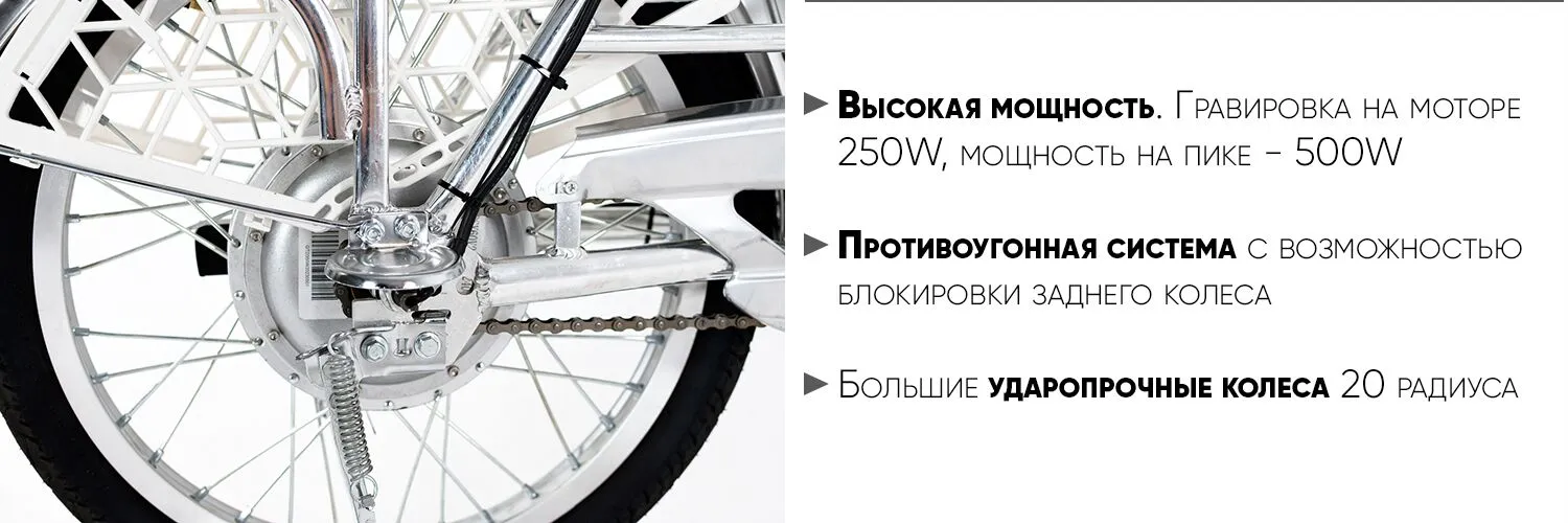 Гибридный (педали + мотор для максимальной эффективности).Грузоподъёмность до 150 кг. Возьмите с собой пассажира или установите грузовую площадку для доставки — этот велосипед выдержит любую нагрузку.