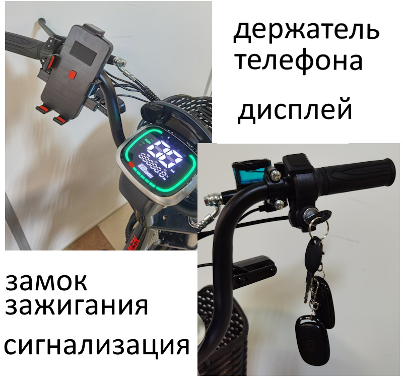 Полная штатная комплектация: Всё уже в коробке! Яркая фара, поворотники, сигнализация с бесключевым доступом, зеркала, корзина и мощная сигнализация. Вам не придётся ничего докупать — просто садитесь и езжайте.