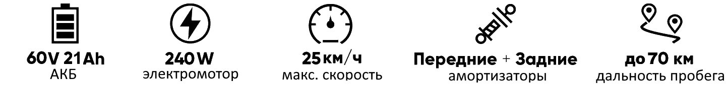 Аккумулятор повышенной ёмкости 21 А·ч: Увеличенный запас хода до 70 км на одном заряде делает вас по-настоящему мобильным. Съёмная батарея заряжается легко и быстро в любом месте.