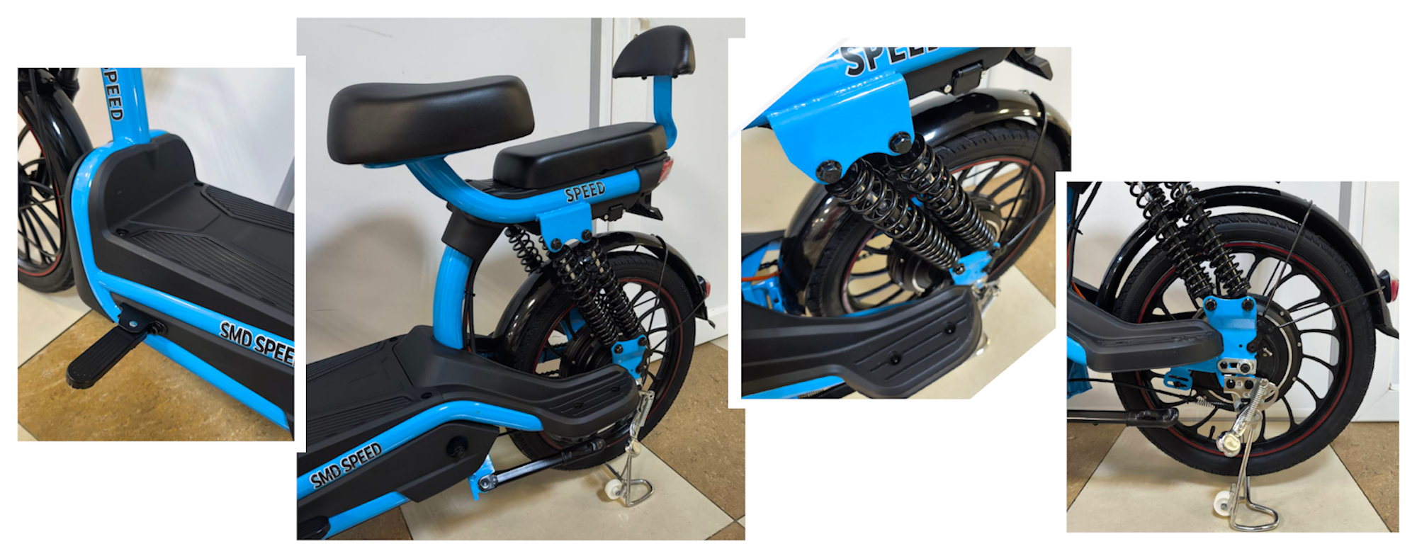 SMD SPEED оснащён 20-дюймовыми колёсами с пневматическими шинами 20×2,5. Литые диски не требуют обслуживания, а широкий профиль покрышек обеспечивает отличную устойчивость и проходимость. Передняя амортизационная вилка и двойные усиленные задние амортизаторы эффективно сглаживают неровности дороги – ямы, стыки и брусчатку. Такая система позволяет комфортно ехать не только по асфальтированным дорогам, но и по дорогам без усовершенствованного покрытия. Тормозная система представлена передними и задними барабанными тормозами. Барабаны отличаются долговечностью, не боятся грязи и воды, легко регулируются и обеспечивают надёжное замедление в любых условиях.
